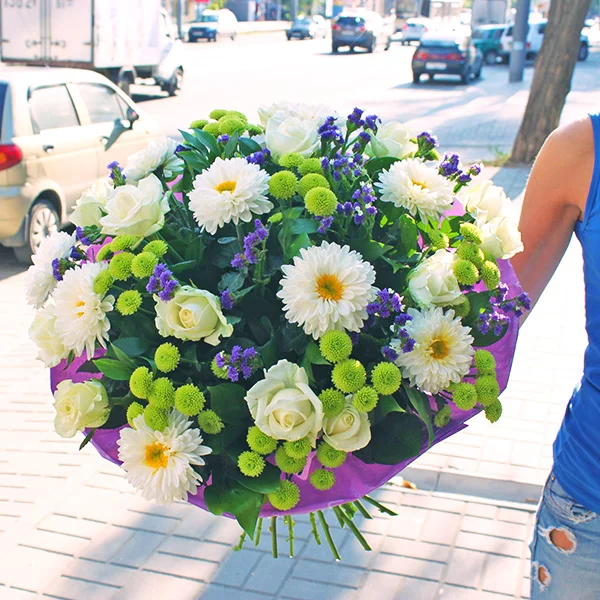 ДЕЛЮКС: роза белая - 15 шт, гербера белая - 9 шт, хризантема кустовая зеленая - 10 шт, статица - 7 шт, салал, фетр из двух слоев - зеленый и фиолетовый, лента. Примерный размер: 45Х45 см.