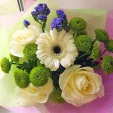 Нежную композицию, составленную из светлых роз и гербер, превосходно подчеркивает кустовая зеленая хризантема. Особое очарование и выразительность придает статица. Яркий фиолетовый букет великолепно подойдет для того, чтобы поздравить коллегу с дня рождения или любым другим торжеством.