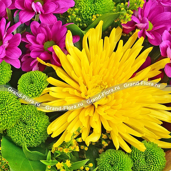 Делюкс: хризантема одноголовая (желтая) - 7 шт., хризантема зеленая кустовая - 7 шт., хризантема фиолетовая кустовая - 7 шт., солидаго - 6 шт., фетр фиолетовый, крафт, лента. Примерный диаметр букета 50х50 см.