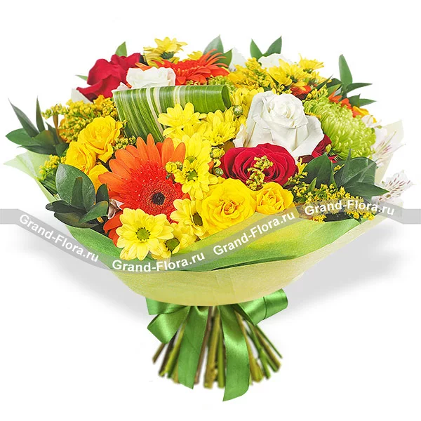 Стандартный (на фото): роза красная - 3 шт., роза белая - 3 шт., гербера оранжевая/красная - 3 шт., кустовая роза желтая/кремовая - 3 шт., хризантема кустовая желтая - 3 шт., декоративная зелень, упаковка